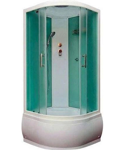 Душевой поддон на ножках, акриловая крыша, алюминиевый профиль белого цвета, передние и задние стенки — безопасное закаленное стекло различной фактуры.