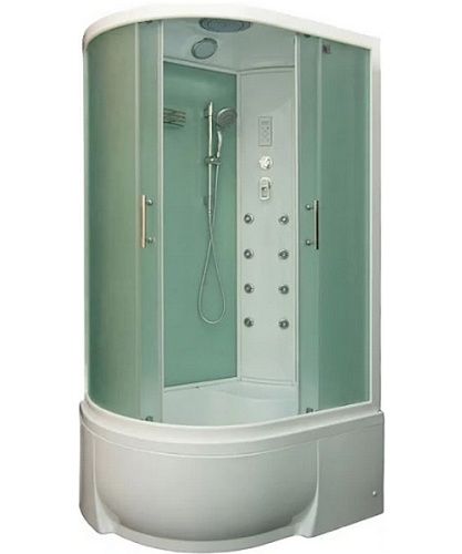 Душевой поддон на ножках, акриловая крыша, алюминиевый профиль белого цвета, передние и задние стенки — безопасное закаленное стекло различной фактуры.