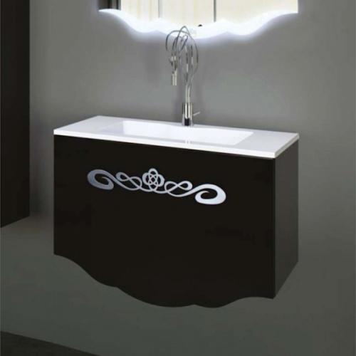 Мебель для ванной La Beaute CHER 85 предназначена для подвесного монтажа в помещениях современного стиля оформления. В комплект входит тумба для раковины, шкаф-пенал, большое прямоугольное зеркало с подсветкой. Гарнитур украшен сложным узором. На выбор предлагается мебель белого и черного цвета.