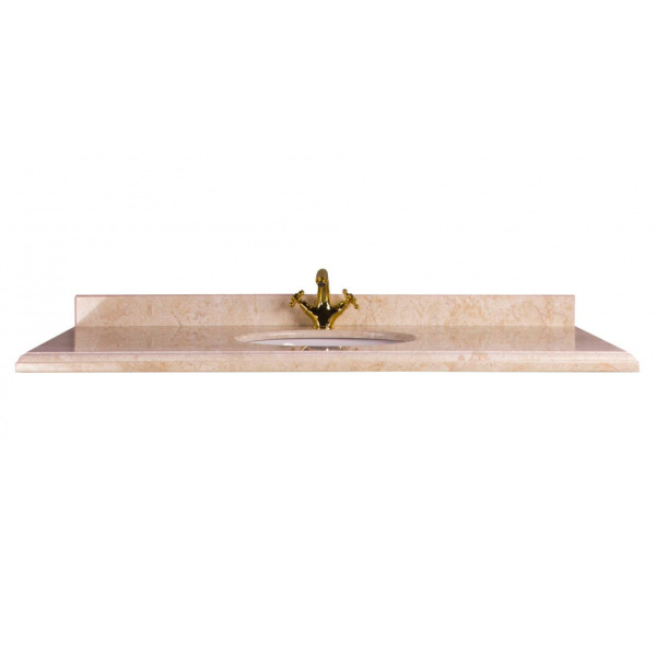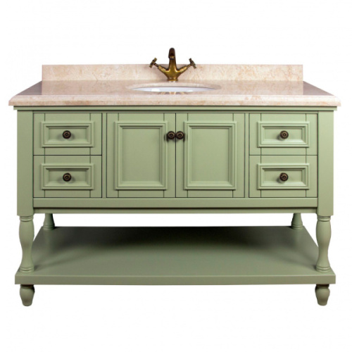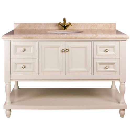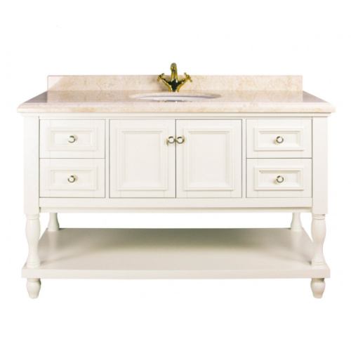 Фасад и корпус изготовлены из МДФ, каркас из массива натурального дерева. При финишной отделке, мебель покрывается высокопрочной водонепроницаемой эмалью. Столешница - натуральный мрамор. Раковина - керамическая. Тумба с 2 дверцами и 4 ящиками. Двери и ящики оснащены системой доводчиков.