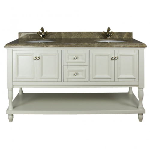 Фасад и корпус изготовлены из МДФ, каркас из массива натурального дерева. При финишной отделке, мебель покрывается высокопрочной водонепроницаемой эмалью. Столешница - натуральный мрамор. Раковина - керамическая. Тумба с 4 дверцами и 2 ящиками. Двери и ящики оснащены системой доводчиков.
