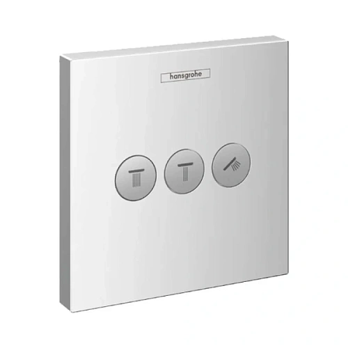 Переключающий вентиль Hansgrohe Shower Select 15764000 оснащен кнопочным управлением. Это внешняя часть встраиваемого переключателя на 3 выхода, выполненная в цвете хром. Модель Select Trio/Quattro встраивается в стену с использованием квадратной металлической панели размером 15х15 см. Запорно-переключающее устройство на 3 потребителя производится из латуни, вся техническая информация есть в инструкции, которая включена в комплект поставки. Переключатель потоков хорошо вписывается в интерьер, гармонично сочетается с фурнитурой.