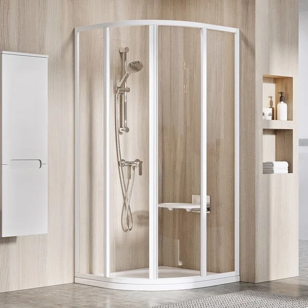 Душевой уголок Ravak Supernova Sabina SKCP4 90 – полукруглый, размером 90х90 см. Панели стеклянные или пластиковые в белом или сатиновом металлическом профиле. Стекло прозрачное или с текстурой Pearl, Grape, пластик фактурный Rain. Особенно эффектно смотрятся варианты белый+рейн и белый+грапе. Уголок монтируется на низкий поддон подходящей формы или сразу на пол при наличии сливного трапа. Габариты установки регулируются за счёт боковых профилей. Дверки раздвижные, без ручек, передвигаются по верхним рельсам.