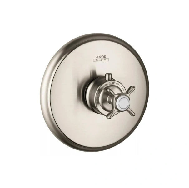 Смеситель для душа термостатический Hansgrohe Axor Montreux 16810 встраивается в стену с использованием круглой пластины. Регулировка воды выполняется ручкой-крестиком. Есть ограничитель температуры воды. Модель выполнена из латуни в цвете хром. Поверхность блестящая, качественная, устойчивая к влажной среде. Термостат подойдет для интерьеров разных стилей.