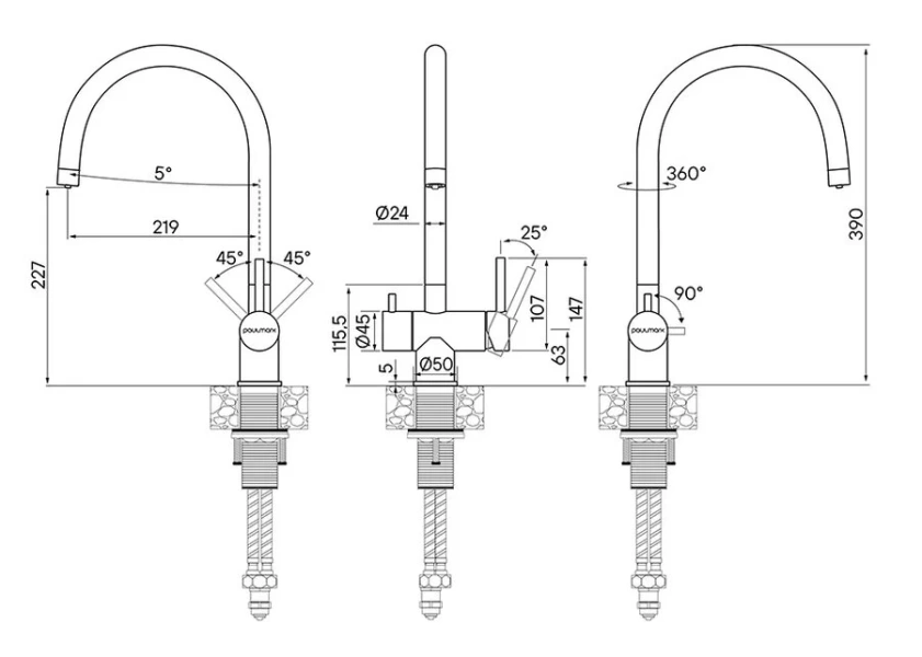 • Комплект поставки: смеситель / гибкая подводка / гайки G1/2" / усиленный комплект крепления / выход для подключения системы фильтрации воды / переходник цанга 1/2" для подключения фильтра