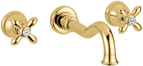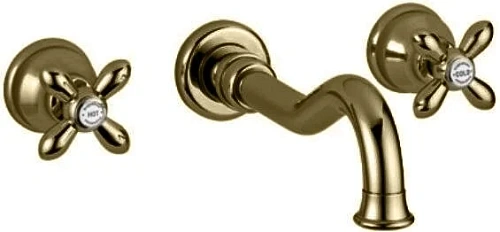 Смеситель для раковины Migliore Princeton Plus ML.PRP-8069 имеет одновременно минималистичный и роскошный вид. Он монтируется на стену на три отверстия – под изогнутый стационарный излив длиной 23 см и два вентиля. Устанавливается с внутренней частью, которую нужно купить дополнительно. Набор изготовлен из латуни с износостойким покрытием. Предлагаются три оттенка: Cr – хром, Do – под золото, Br – под бронзу, CrDo – хромированный с золотистым декором. Обычные крестообразные вентили можно заменить на ручки с кристаллами Swarovski.