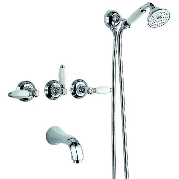 Смеситель для ванны Nicolazzi Monterosa 1803 предназначен для настенного монтажа. Для этого требуется четыре отверстия. Душевая система крепится на стену при помощи специального держателя. Длина излива составляет 17 см. Ручки можно выбрать металлические, керамические или с кристаллами. Оборудование производится из латуни в нескольких оттенках.